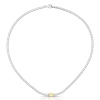 Um colar versátil e elegante que pode ser usado sozinho para um visual minimalista e sofisticado, ou combinado com brincos de pérolas e acessórios em ródio para uma composição ainda mais refinada.